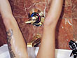 This was much easier said than done. The faucet was considerably higher than in an average tub, the walls were especially tall, and it was difficult for Chantelle to keep her body in the correct position. [Well, she also weighs about a pound and a half, so she must float fairly easily.] Also, the tub was hard and cold! Warm water heated things up a bit, and a towel helped cushion Chantelle’s head and back, but the position was still not the comfortable one most women can attain in a regular-sized bathtub — and it was not one conducive to orgasming. [Chantelle was probably thinking, “I was supposed to have Shayla licking me, and now I’m trying to get off rolling upside down in a bathtub?” … If you stop to think too much during sex — even with yourself — it can really kill the mood. … On the upside, she did receive an excellent robe as a fine parting gift.]